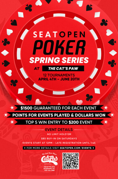 Saturday Tournament Spring Series! 12 Events of No Limit Hold’em Tournament. $1,500 Guaranteed Prize Pool. In addition to the cash payouts, players earn points for each event and accumulate points over 12 weeks for the Title. Top 5 Win a Seat into our next $200 Buy-in Event! The cash games will start by 3PM, sometimes earlier. Please call us at 406.404.1968 if you have any questions.