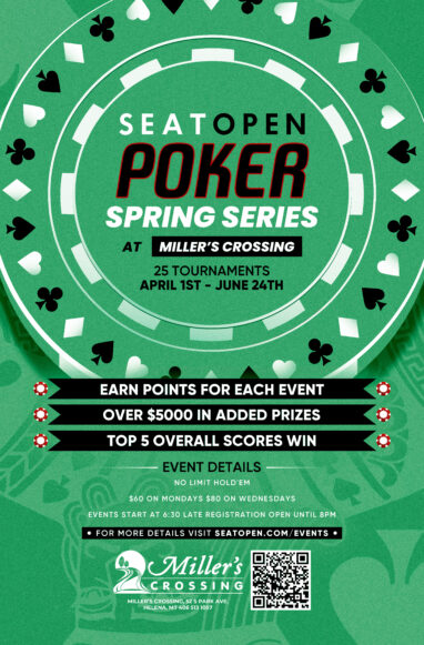Spring Series at Miller’s – 25 Separate No Limit Hold’em Events. Start with 20,000 Chips. In addition to regular cash payouts, $200 will be added to the Prize Pool and points will be awarded for each event. The Overall Top 5 point earners at the end of the Series will each earn Cash Game Free Play. The Champion will receive the Trophy & Title! Cash Game Runs 7 Days a Week Starting at 6:30pm. Please call us at 406.513.1057 if you have any questions.