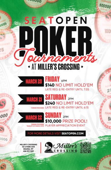 Join us for our Spring Poker Tournaments at Miller’s Crossing! Single Day, Re-Entry Event. 15,000 Starting Chips. 20 Minute Levels. Registration Open until 7:55pm. Call us at 406.513.1057 if you have questions.