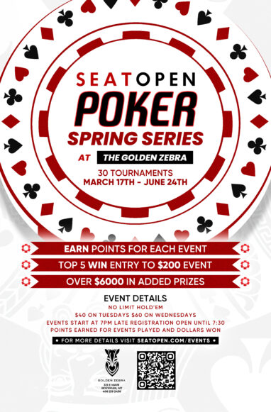 Tournament Series Running Tuesdays & Wednesdays: March 17th – June 24th. No Limit Hold’em. $200 Added to the Prize Pool. In addition to the cash payouts, players earn points for each event and accumulate points over 15 weeks for the Title. 20,000 Starting Chips. Cash Games afterwards. Please call us at 406.219.2436 if you have any questions.