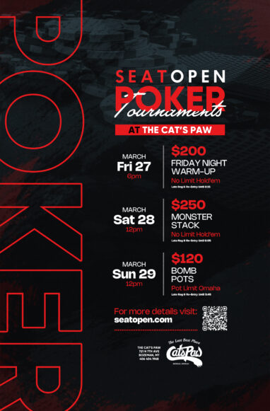 $250 Buy-In No Limit Hold’em Re-Entry Event. 2pm Start. Start with 80,000 Chips. 20 Minute Levels. Food will be served after level 10. Please call us at 406.404.1968 if you have any questions.