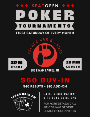 Monthly No Limit Hold’em Tournament at the Palace Bar & Lanes in Laurel! $60 Buy-In. Start with 15,000 Chips. 20 Minute Levels. $40 Rebuys for 15,000 Chips. Take the $10 Add-On at the First Break and get an Extra 5,000 in Chips. Live Action. More Fun. Please call us at 406.206.1960 if you have any questions.